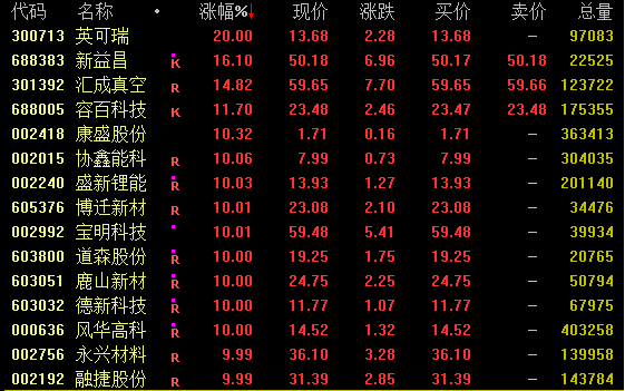 锂电池概念今天强势上升。截至收盘,英可瑞“20厘米”涨停,新益昌涨幅超过16%,汇成真空涨幅近15%。协鑫能科、盛新锂能、宝明科技、融捷股份、永兴材料均涨停,亿威锂能、天齐锂业涨幅约6%,赣锋锂业涨幅近5%。