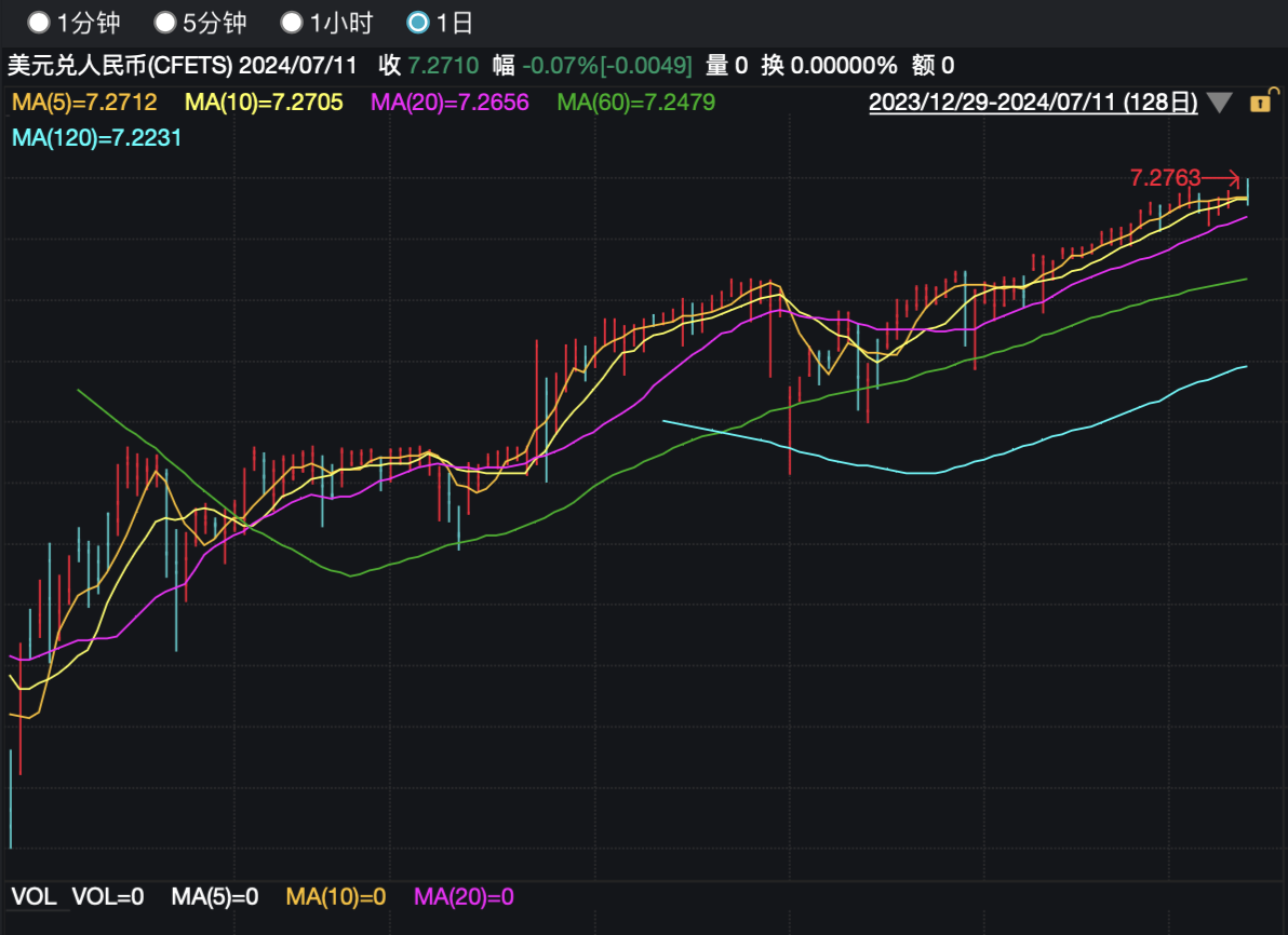 事实上,由于国内外仍有较大的利差,今年以来,人民币兑美元汇率普遍疲软,在岸和离岸市场持续下跌至今。自2023年5月“破7”以来,人民币已在“7”上运行超过1年,是2015年汇改后最长的“7”运行时间。