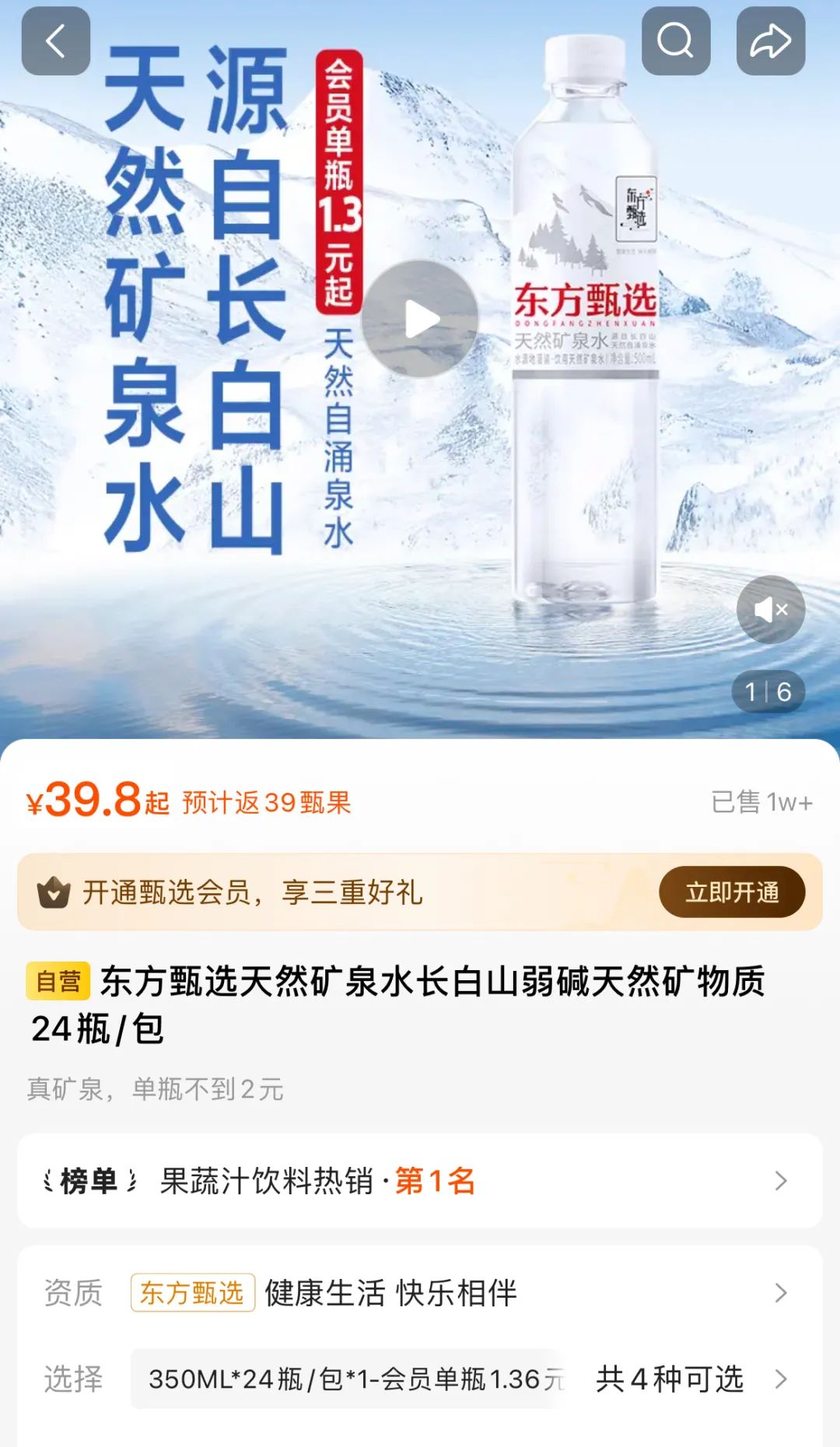 而且刚刚推出的东方选矿泉水,目前已经在东方选矿APP平台上架,优惠价格为39.8元/包(350mL*24瓶)和45.41元/包(500mL*24瓶),确实如上所述,每瓶到家价格控制在2元以内。