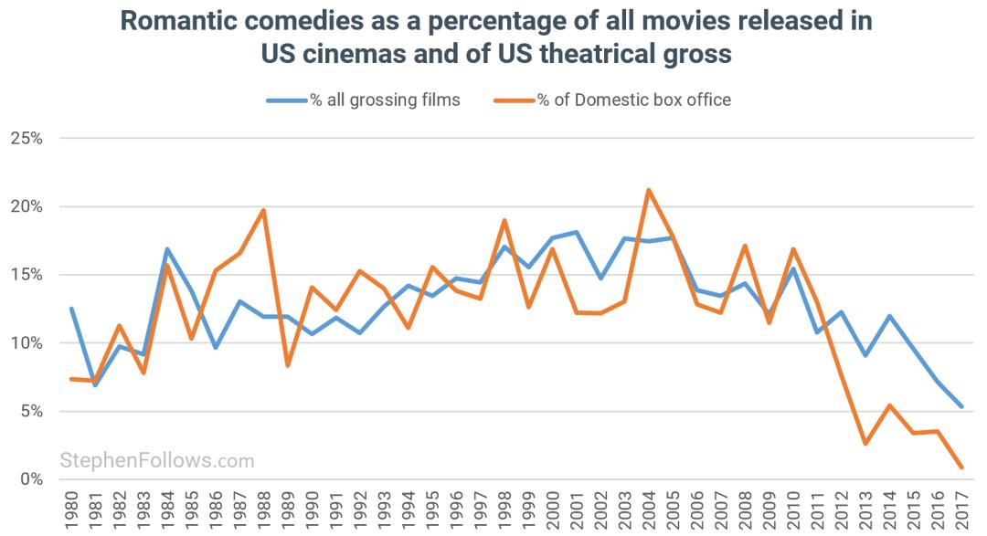 在2018年的一项研究中,美国电影数据分析师斯蒂芬·法萝指出,在过去的40年里,爱情电影占美国所有故事片的4.4%,但占电影院上映电影的13%,显然供不应求。2001年巅峰时期,当时电影院上映的电影有18%以上是爱情片,但2017年跌至5%,不仅数量下降,而且票房收入也下降。