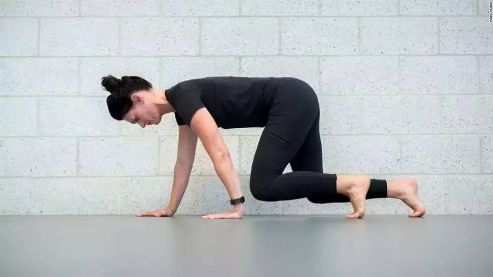 动作就像小时候的爬行动作。这个动作可以锻炼保持头部重量的颈部和背部肌肉,同时将身体重量分散到四肢,大大减轻腰椎的压力。