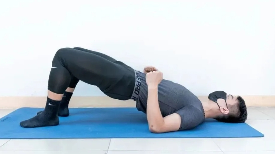 这个动作更适合肌肉力量差或者年龄大的患者。五点是指双脚、两个肘部和头部。做法是尽量抬高腹部,臀部离开床,坚持一两秒钟,然后逐渐回到原来的位置。动作的关键点是慢慢起床,慢慢下来。