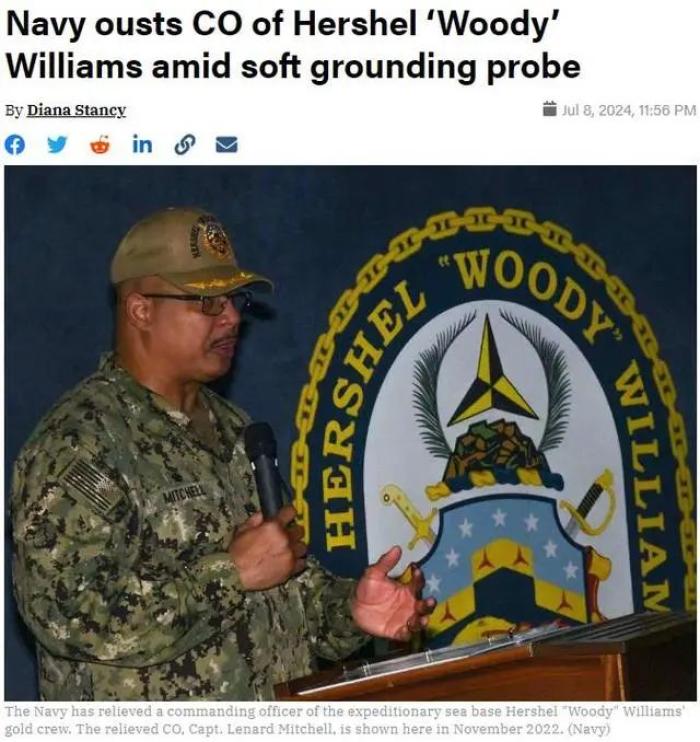 当地时间7月8日,美国海军发布新闻稿称,美国海军对伦纳德·米切尔(Lenard C. Mitchell)解职决定是基于今年“赫谢尔·伍迪·威廉姆斯”发生的搁浅事故调查。“虽然调查仍在进行中,但在调查过程中发现事实足以证明消除指挥官的职位是合理的。”