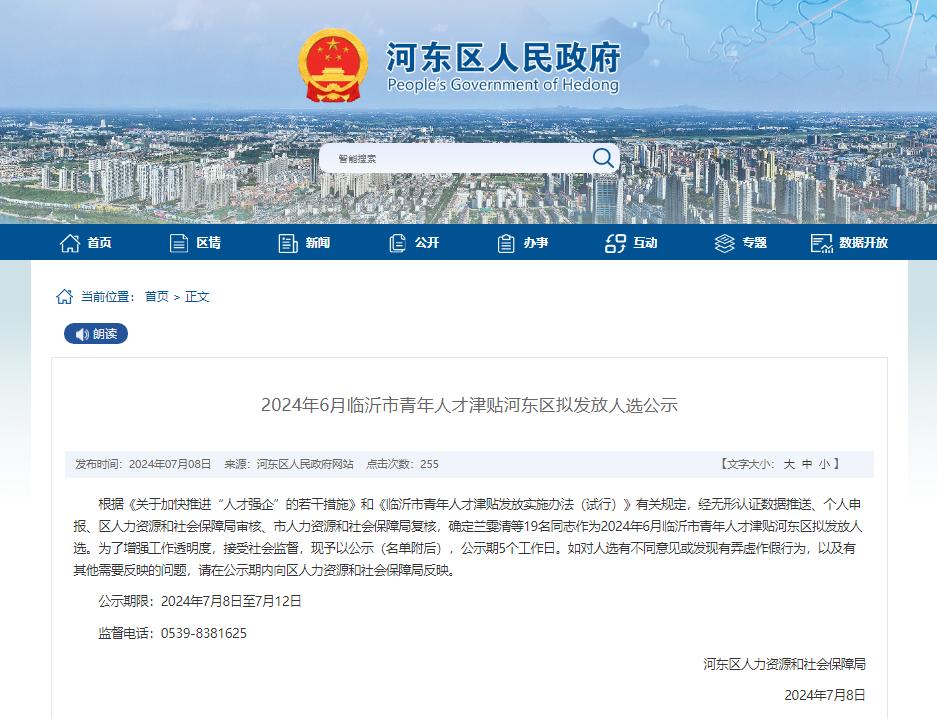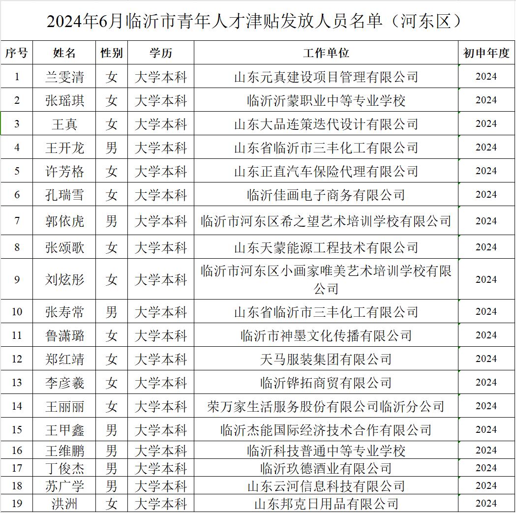 根据《加快推进“人才强企业”若干措施》和《临沂市青年人才津贴发放实施办法(实施)》的有关规定,经无形认证数据推送、个人申报、区人力资源和社会保障局批准、市人力资源和社会保障局核实,确定2024年6月临沂市青年人才津贴河东区拟发放兰雯清等19名同志。为提高工作透明度,接受社会监督,现公布(名单附后),公告期为5个工作日。如果您对候选人有不同意见或发现欺诈行为,以及其他需要反映的问题,请在公示期内向区人力资源和社会保障局反映。
