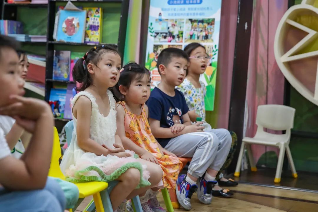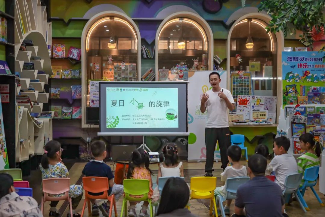 在钟书阁一楼的时间童书馆里,松江区图书馆的段小刚先生通过生动有趣的故事和生动的图文展示,向孩子们介绍了夏季节气的习俗来源和特点。"这段时间小暑节气会发生什么神奇的事情?”段小刚说,“中国古代把小暑分成三候,一候温风,二候蟋蟀居宇,三候鹰始。”孩子们睁着好奇的大眼睛,认真地倾听,沉浸在节气文化中。