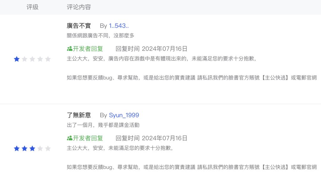 但另一方面,我们也看到了“主人逃跑”的隐患。比如在台湾省市场的iOS评论中,有玩家反馈说“副游戏的内容和广告不一样”、氪金的内容太多了,等等,都可能是束缚商品业绩发展的因素。