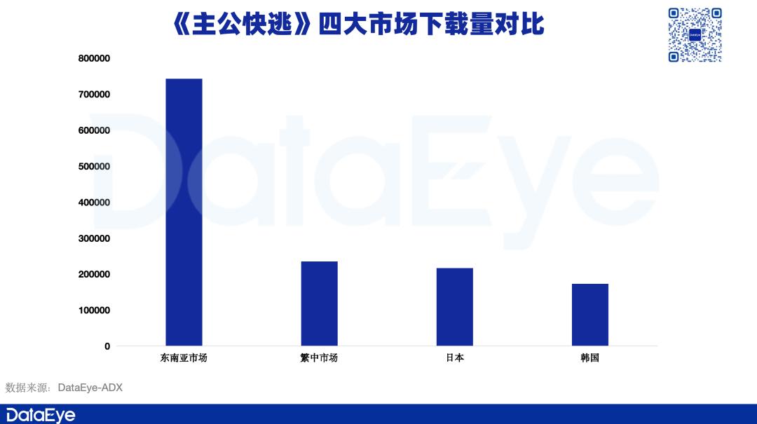 下载量方面,点点数据显示,《大师快逃》上线后,海外市场双端下载总量超过136万次,其中东南亚市场与其他三大市场存在明显差距,总下载量超过70万次,韩国市场最低,下载量只有17万次。