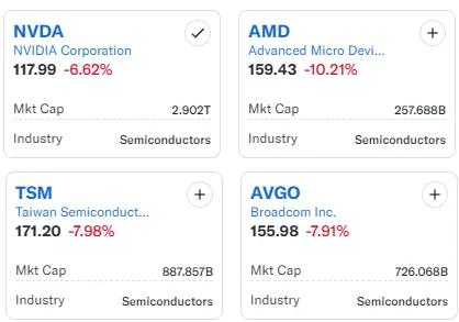 受上述消息影响,英伟达下跌6.6%,台积电下跌7.9%,AMD下跌10%。AVGO下跌7%