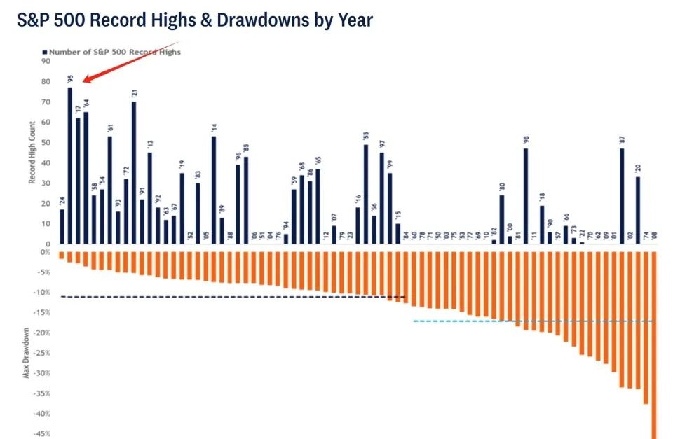 据美股投资网报道,周三的下跌发生在标准普尔500指数创下38个新高(历史收盘)之后。本来市场还是期待今年冲击1995年标准普尔创下新高频的数据,这也是1928年以来的最高值。顺便说一句,标准普尔500指数在1995年创下77个新高,然后在2021年达到70个门槛。