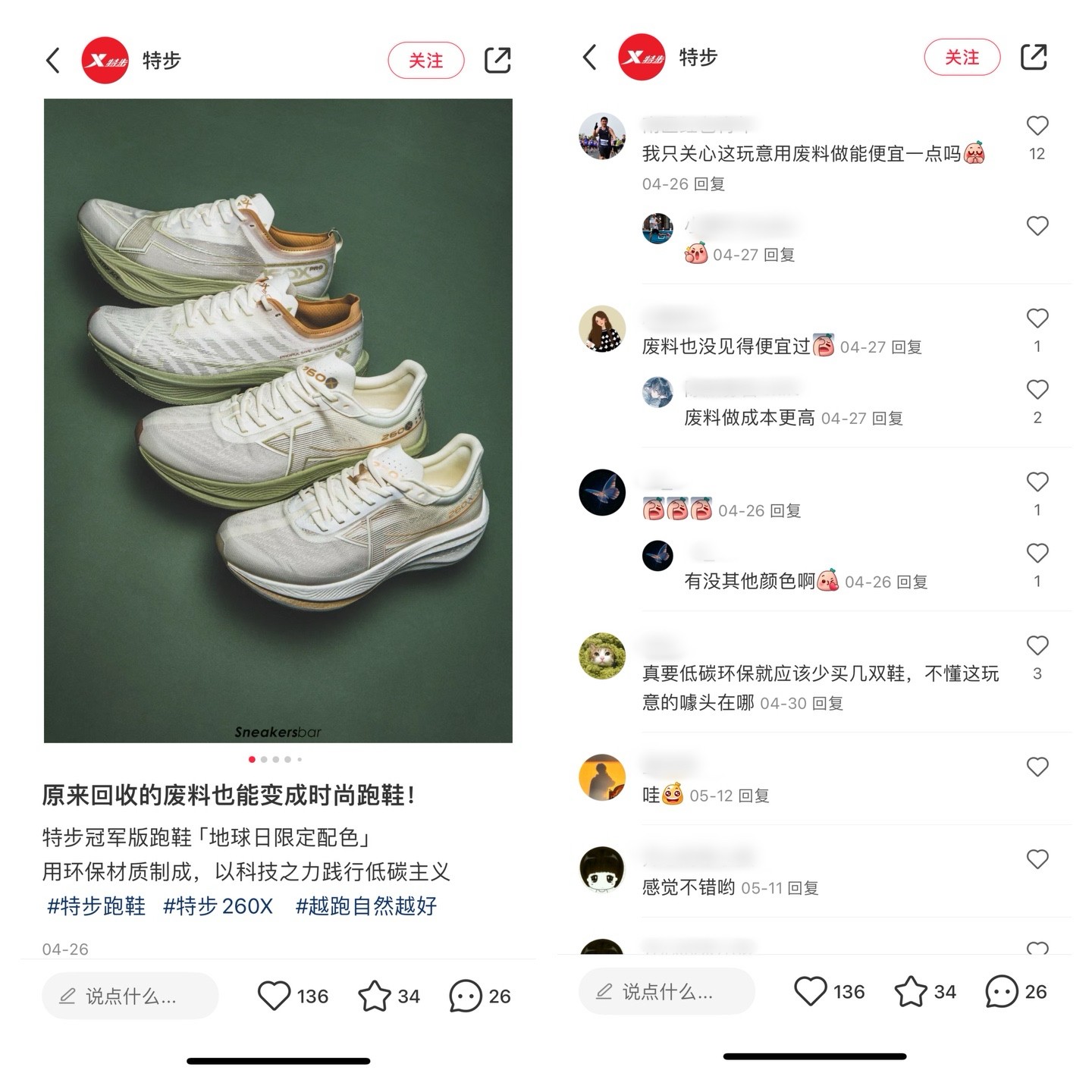 在特步环保运动鞋的小红书帖子下,这句话成为了最受好评的评论。今年4月22日(世界地球日),特步发布了三款限制跑鞋。官方表示,跑鞋使用提取自油脂和餐余废油的生物基材。