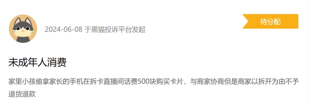 但也有相当一部分与未成年人拆卡有关,比如“家里的孩子用父母的手机看拆卡直播间花了几千块钱,客服以卡已经拆了为由拒绝退款”。