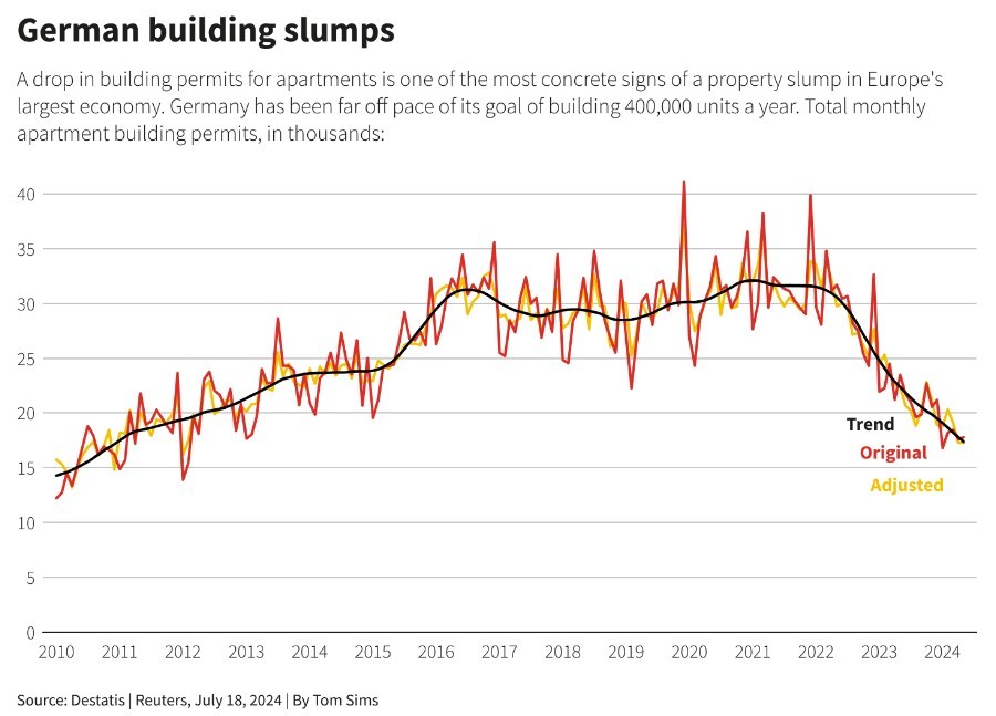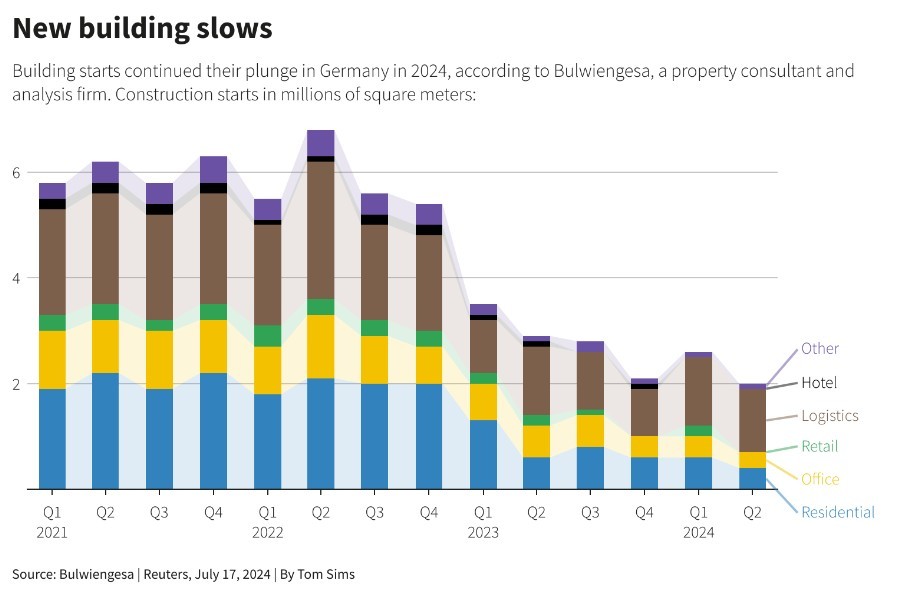 多年来,低利率和强劲的经济一直保持着德国房地产市场的繁荣,但这一繁荣在2022年结束,当时猖獗的通货膨胀迫使欧洲央行迅速增加贷款成本,逐渐导致房地产融资不足、支付失败、项目停滞、大型开发商破产。