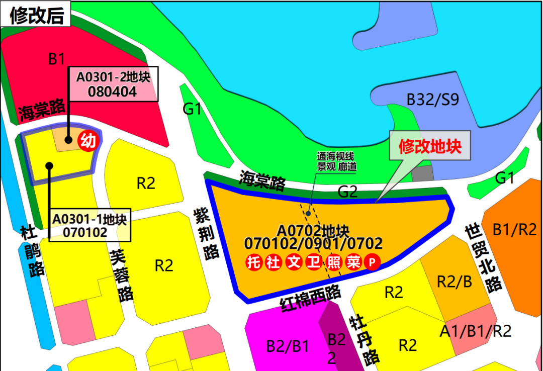 据公示内容显示,A0702地块原用地为酒店用地,容积率为≤建筑密度1.0≤建筑限高20%≤25米,绿化率≥40%。修改后,土地使用面积不变,酒店用地改为二类城市住宅/商业/城市社区服务设施混合用地,规划指标按容积率计算。≤2.0、建筑密度≤25%、建筑限高≤100米,绿化率≥40%。