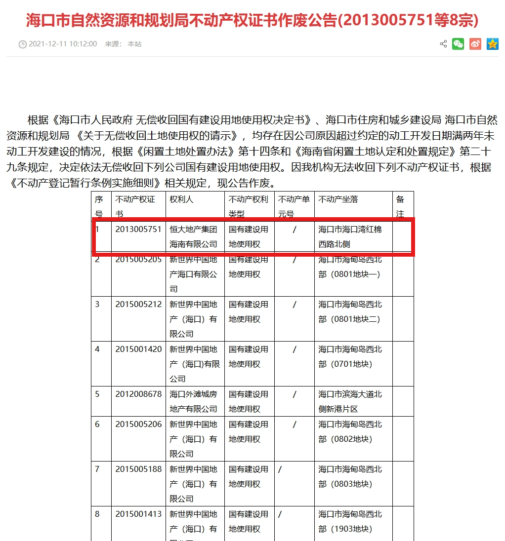 海口市资产监督管理局于2021年12月中旬发布的《不动产权证书作废公告》也证实了上述人士的说法。