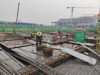 高架客平台桥段总长度348.7米,上部结构主要采用预制混凝土或钢箱梁的方式,根据跨度和道路平面线形的不同;下部结构,桥桩采用钢筋混凝土独柱墩,桥台采用轻型桥台。高架桥梁现浇梁的最大跨度为33.6米,最大宽度为35米。为了保证现浇梁的施工质量,地下车库在施工过程中应回顶,以保证大箱梁的施工荷载传递。现在高架落客平台正在三跨现浇梁同时进行模板、钢筋施工,钢箱梁正在预制生产中。