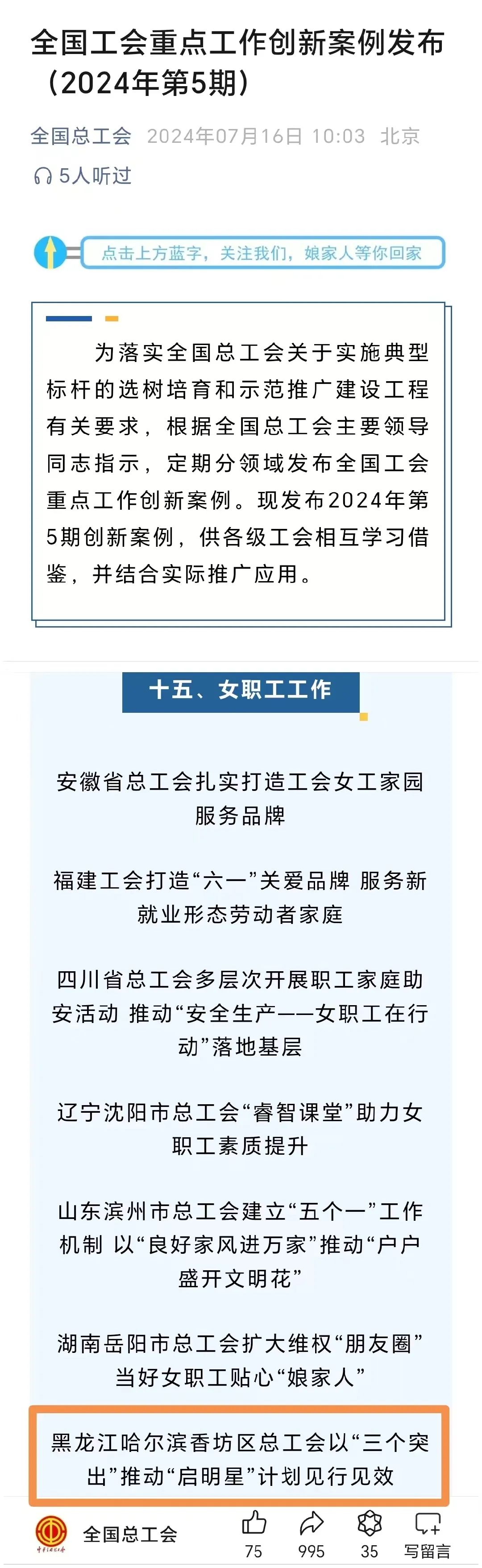 近日,黑龙江省哈尔滨市香坊区总工会以“三个突出”的创新案例当选全国工会重点工作创新案例,推动“启明星”计划见效。