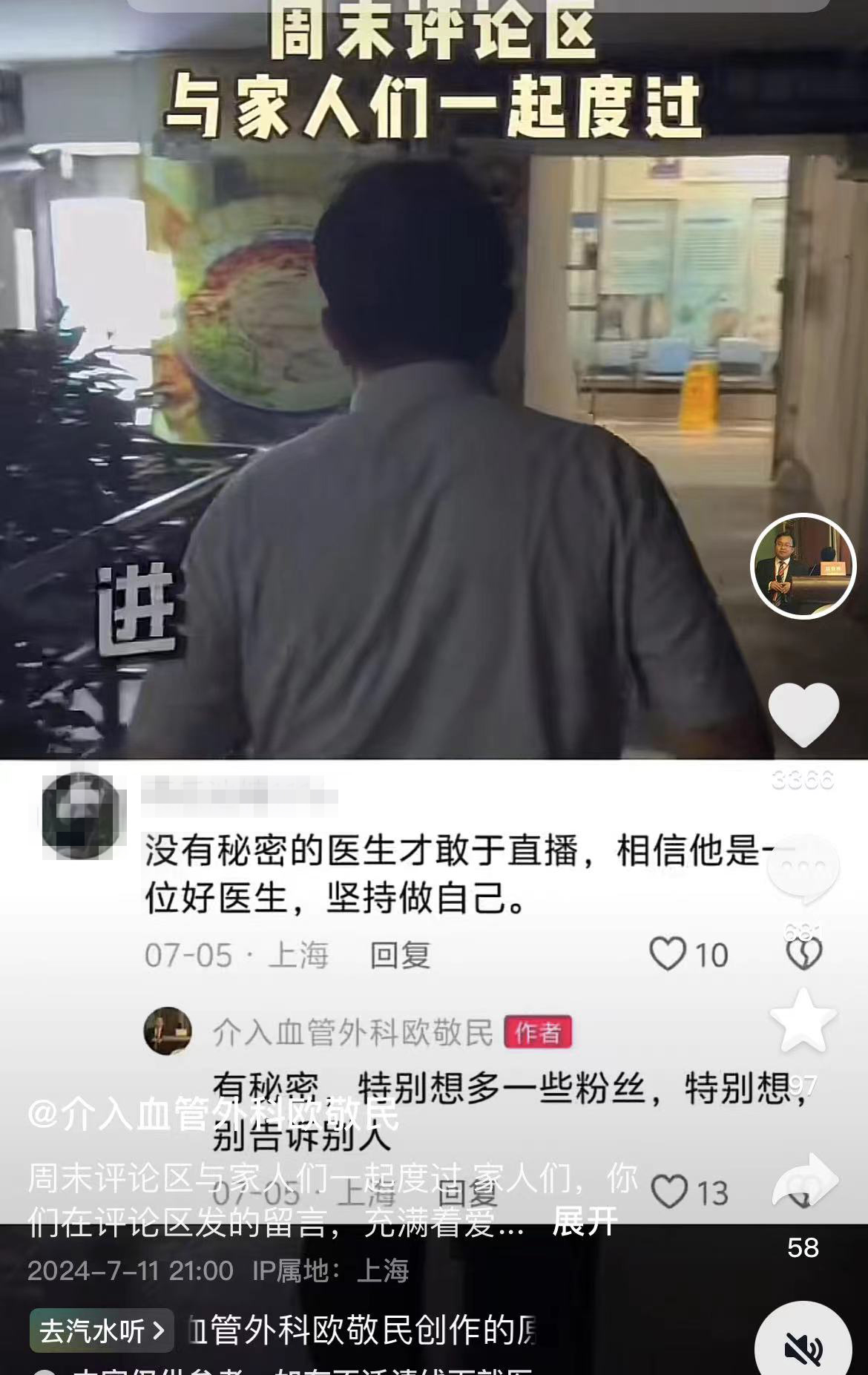 在网上走红后,欧敬民最近的一条直播记录停留在6月30日。他承认“最近工作太忙了”,白天和晚上去看医生、查房、做手术已经成为一种常态。