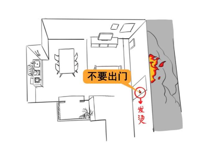 当同一层起火时,我们应该首先触摸门把手。如果门把手发烫,说明外面有火(或者有高温烟)。这个时候,我们不应该开门,而应该把门塞紧,洒水降温。