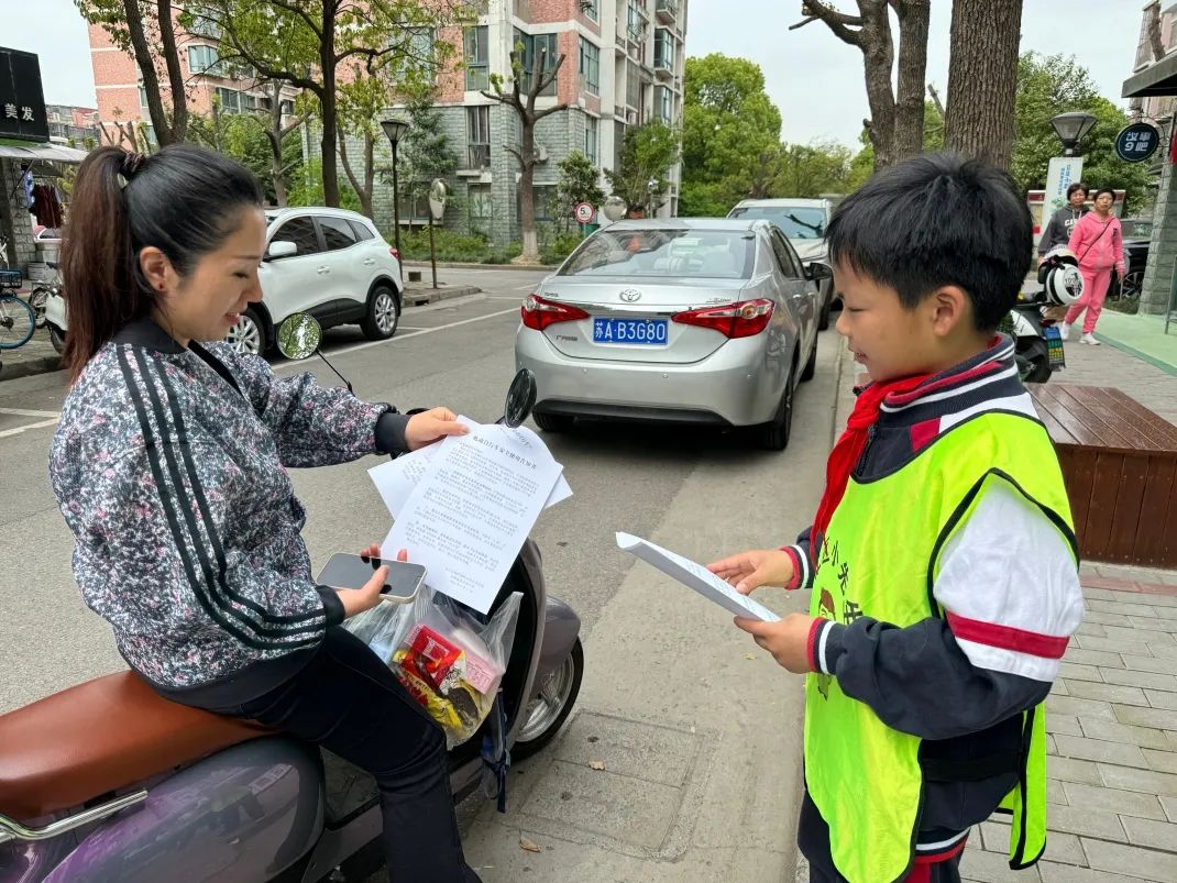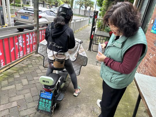 志愿者发放电动自行车安全通知书