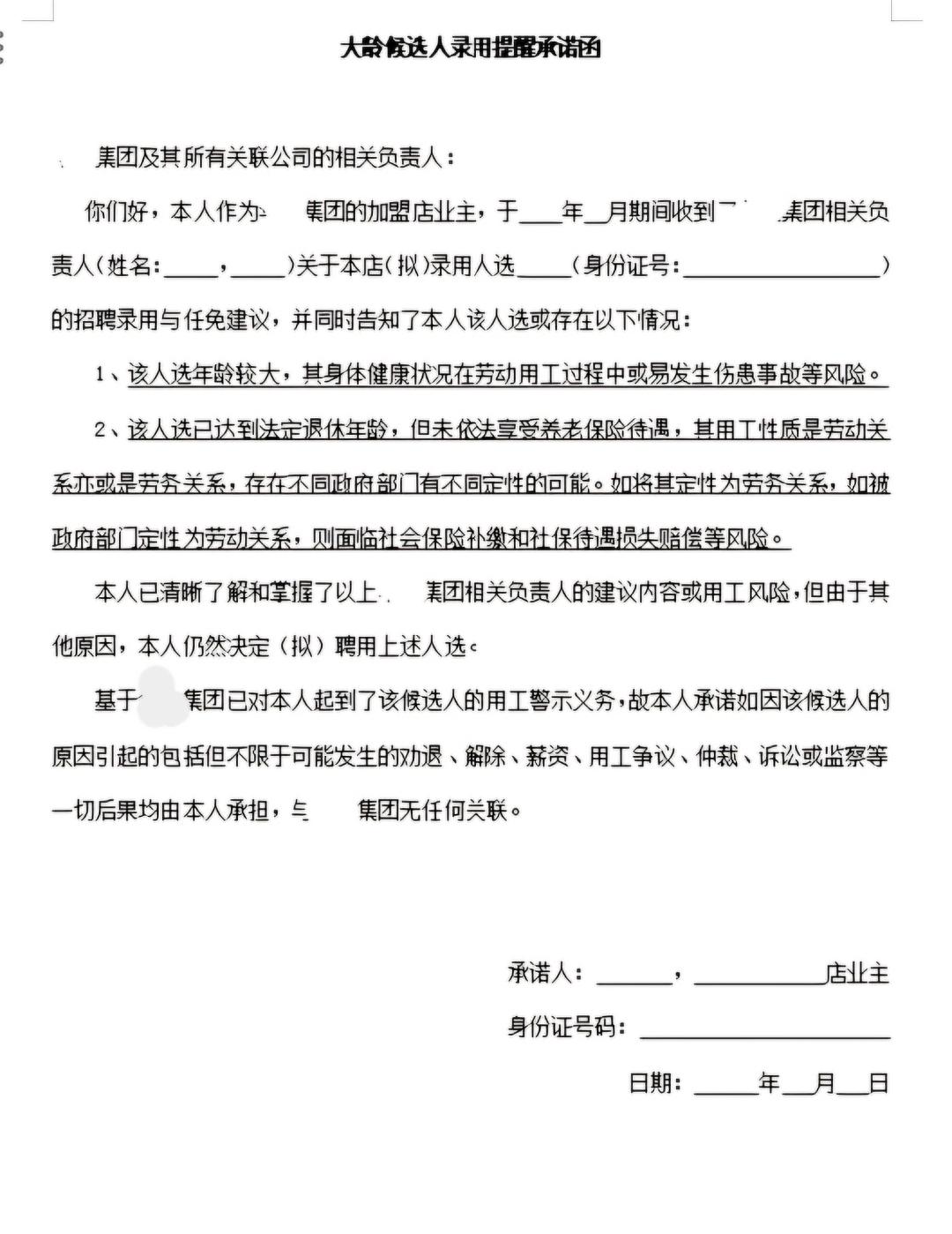 原因是某连锁酒店集团加盟商A总在准备雇佣一名60岁以上的老年员工时,收到了该集团发出的“高龄候选人招聘提示承诺书”。