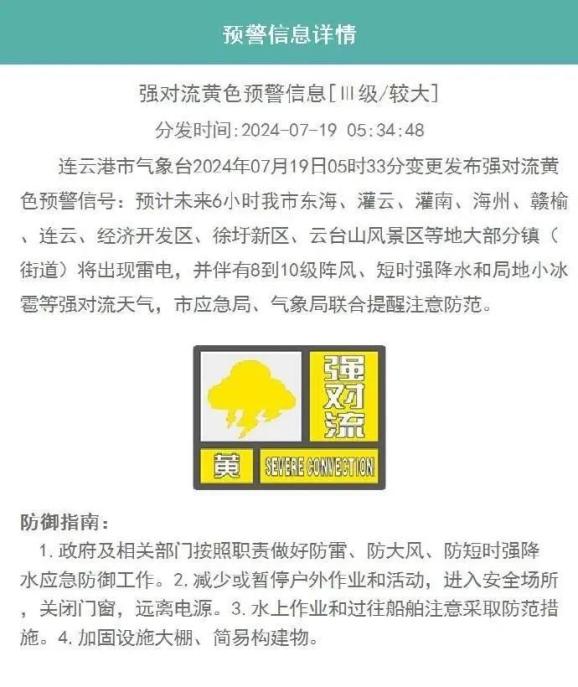 预计未来6小时,市应急局和气象局将联合提醒我市东海、灌云、灌南、海州、赣榆、连云、经济开发区、徐伟新区、云台山景区等大部分城镇(街道)发生雷击,伴有8-10级阵风、短期强降水、局部小冰雹等强对流天气。