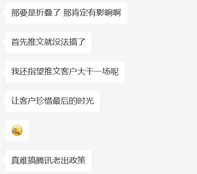 也有合作伙伴表示,如果折叠是大势所趋,不如先努力一波,而不是生气。现在还有不受影响的用户,可以快速使用发送频率,尽可能保持业绩。