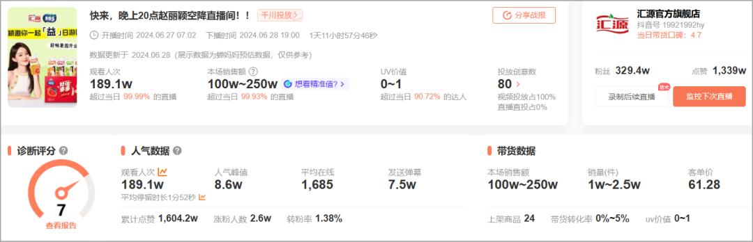 6 月 27 日,@汇源官方旗舰店 直播间邀请了代言人赵丽颖,直播最高在线人数达到8.6。W,但是销售额只有 100W ~ 250W。