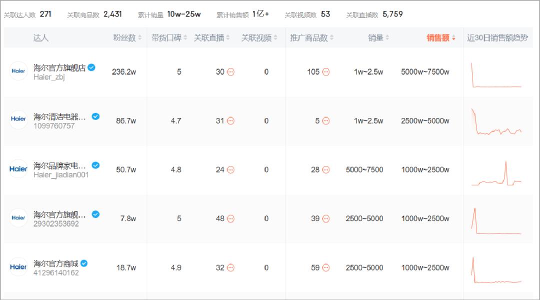 共有海尔品牌 200 多个矩阵帐号。近 30 天啊,销售前三名的账号分别是粉丝数量236.2万的账号。 @海尔官方旗舰店 、86.6 万的 @海尔清洁电器旗舰店 和 29.8 万的 @海尔洗衣机旗舰店 。他们的销售额分别为5000W。 ~ 7500W、2500W ~ 5000W 和 2500W ~ 5000W。