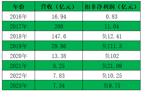 由此看来,实际获得的众泰汽车运营资金有限,所以它的表现并没有很大的提升,除了继续亏损之外,2017年的收入也从208亿下降到了2023年的7.34亿。
