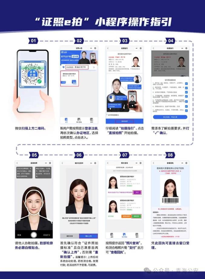 青海省公安厅为深入贯彻落实全国公安工作会议精神,进一步深化公安政务服务改革,积极响应人民群众对高效便捷服务的需求,积极探索创新推出“证件e拍”小程序,完成手机自助收集居民身份证人像照片功能。从7月18日起,我省所有需要办理居民身份证的省内外居民,不仅可以在派出所(办证大厅)居民身份证受理窗口收集人像照片,还可以通过手机轻松收集居民身份证人像照片。这项便民措施使居民可以随时随地收集人像照片,特别是为行动不便的老年人、残疾人等特殊群体提供了极大的便利,简化了居民身份证人像照片的收集流程,满足了居民身份证人像采集的多种方式和个性化需求,让群众拥有满意的居民身份证。