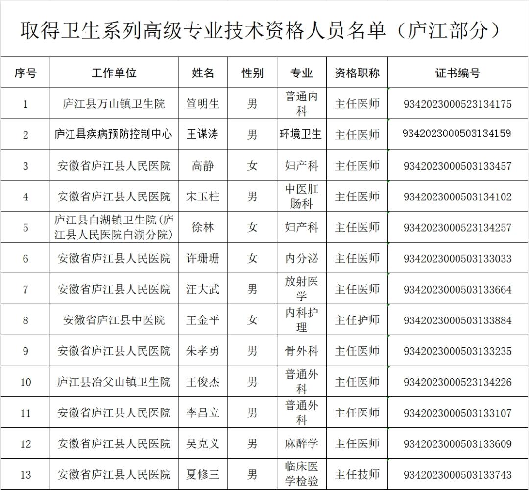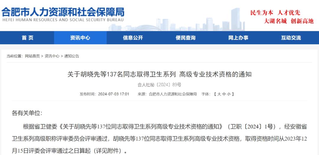 根据省卫生健康委《关于胡晓先等137名同志获得卫生系列高级专业技术职称的通知》(卫生职称〔2024〕1号),经安徽省卫生系列高级职称评审委员会批准,胡晓先等137名同志获得卫生系列高级专业技术职称,从2023年12月15日评审批准之日起(详见附件)获得资格。