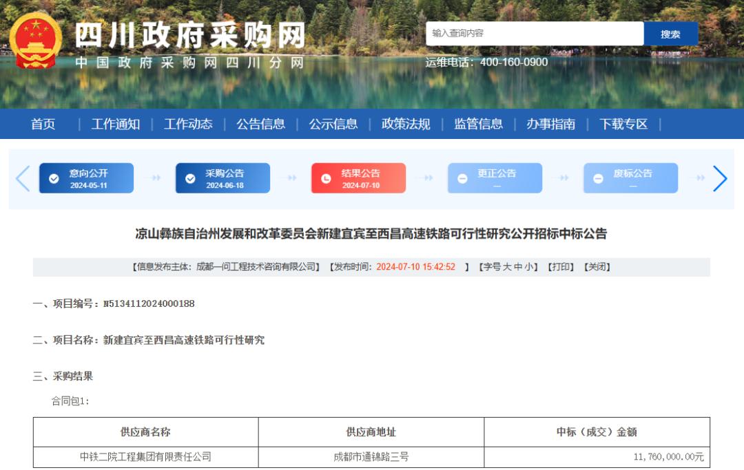 记者从四川政府采购网了解到,凉山州发改委近日发布《新建宜宾至西昌高速铁路可行性研究公开招标中标公告》,项目可行性研究工作将正式启动,中铁二院工程集团有限公司中标项目1176万元。宜宾至西昌铁路项目(以下简称“宜西高铁”)起源于宜宾市,经凉山州雷波、美姑、昭觉,止于西昌市。据报道,该项目正线总长约316km,桥梁隧道占93%,设计速度350km/m。h,预计投资总额约为689亿元,建设期为6.5年。如果按照350公里/小时的高速铁路标准建设,项目建成后,西昌到宜宾只需1.5小时,西昌到成都、重庆只需2.5小时。(成都发布)
