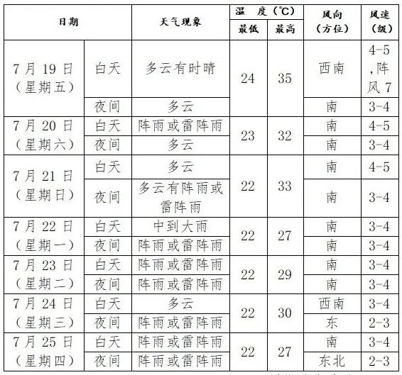 7月19日06时,中央气象台继续发布黄色暴雨预警:预计7月19日08时至20日08时,四川盆地北部和西南部、陕西南部、河南西南部和东部、安徽北部、江苏北部、山东南部、广西南部沿海地区、广东南部沿海地区、海南西部地区、云南南部地区、吉林中部地区、辽宁中部地区将大到暴雨,其中四川盆地北部和山东南部有大雨(1000)~150mm)。上述部分地区伴有短时强降水(最大降水量为30小时)~50mm,局地可超过60mm),局地有强对流天气,如雷暴大风。