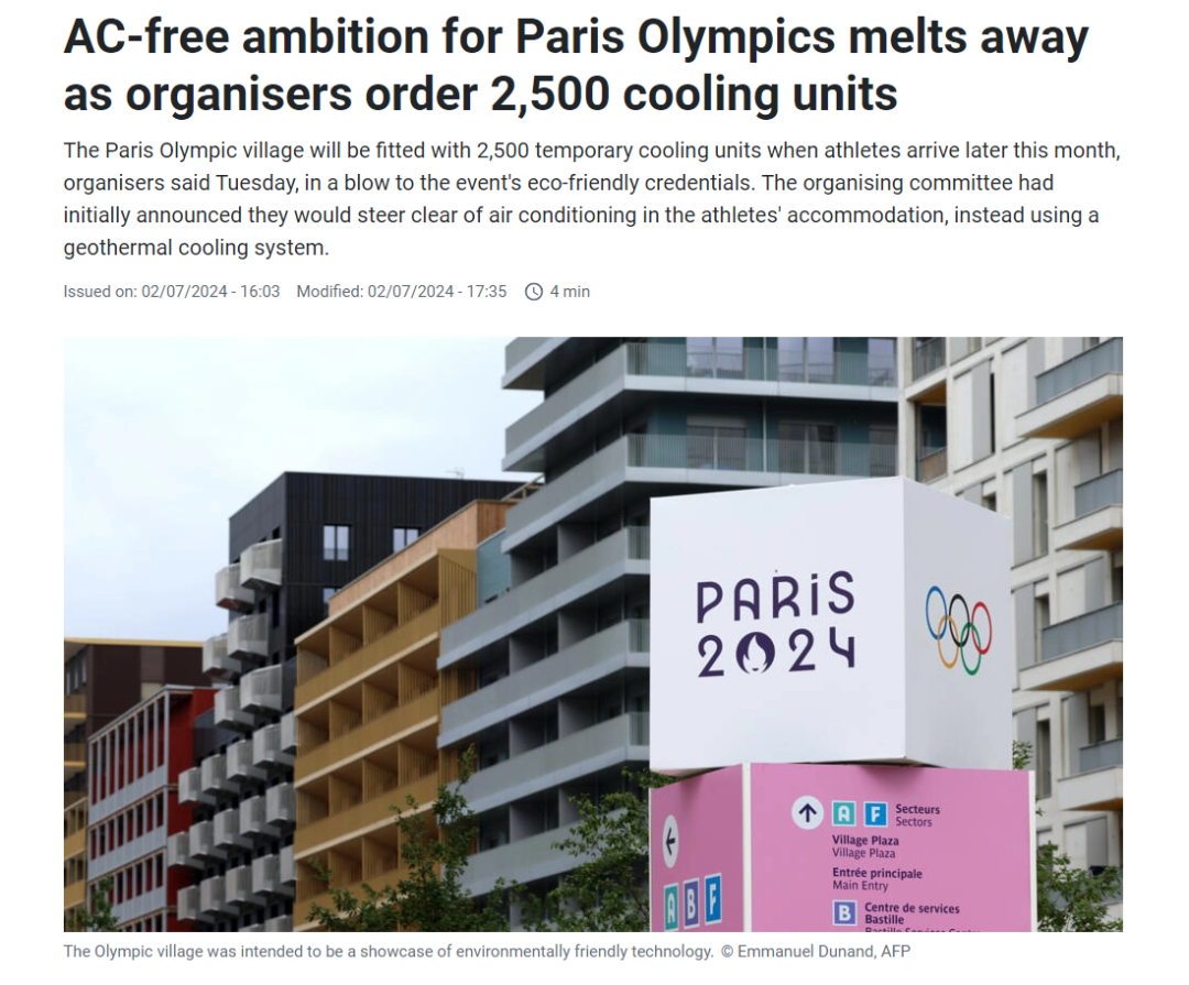 2024年巴黎奥运会即将开幕。巴黎奥组委此前宣布将在奥运村“放弃空调”节能降耗,在多个国家的代表团中引起争议。许多代表团表示,他们将自己带空调入住巴黎奥运村。