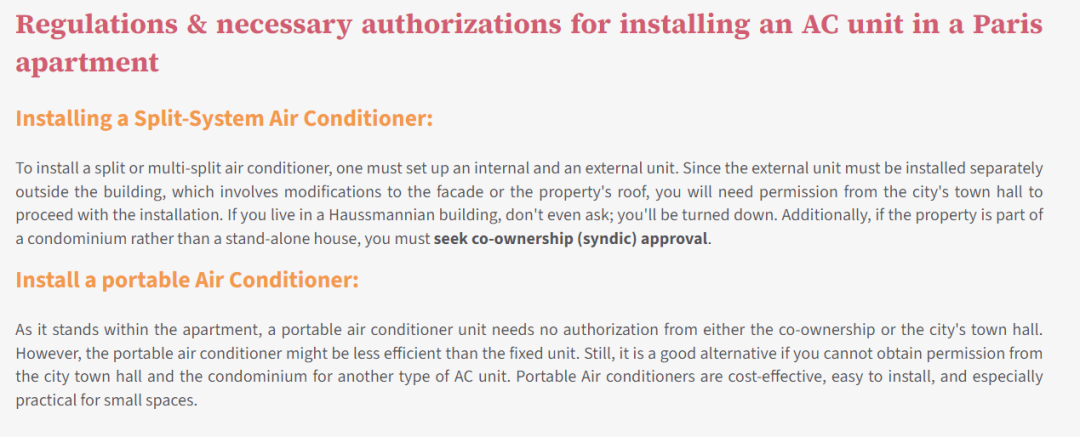 在巴黎,空调大致可以分为两种:分离式和便携式。分体式空调的外部机器一般安装在建筑物外部,涉及外墙或屋顶的变更,需要巴黎市政厅的许可和共同业主的同意。公寓安装便携式空调不需要获得共同业主或市政厅的批准。