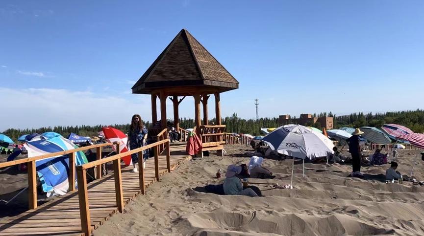 七月十五日,游客们正在感受“沙疗” 。拍摄:吾尔妮莎·买买提