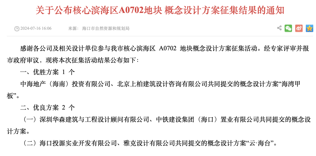 七月十六日,资产监督管理局公布了海口市核心滨海区A0702地块概念设计方案征选结果。