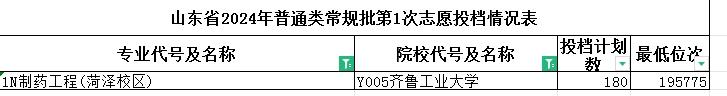 通过《山东省2024年普通类常规批次第一次志愿申请表》,可以继续搜索考生的第三名志愿者,齐鲁工业大学的制药工程专业,找出该专业最低申请排名为195775,低于小王,因此被齐鲁工业大学录取。