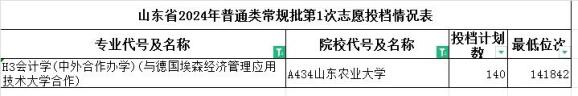 小王高考成绩494分,排名195122。与《山东省2024年普通常规批次第一次志愿申请表》相比,他依次搜索了考生的第1-96名志愿者。首先搜索第一个志愿者,山东农业大学会计(中外合作办学)专业(与德国埃森经济管理应用技术大学合作),可以看到这个专业的最低排名是141842。 , 高于小王的排名,所以没有被第一名志愿者录取,需要继续搜索。