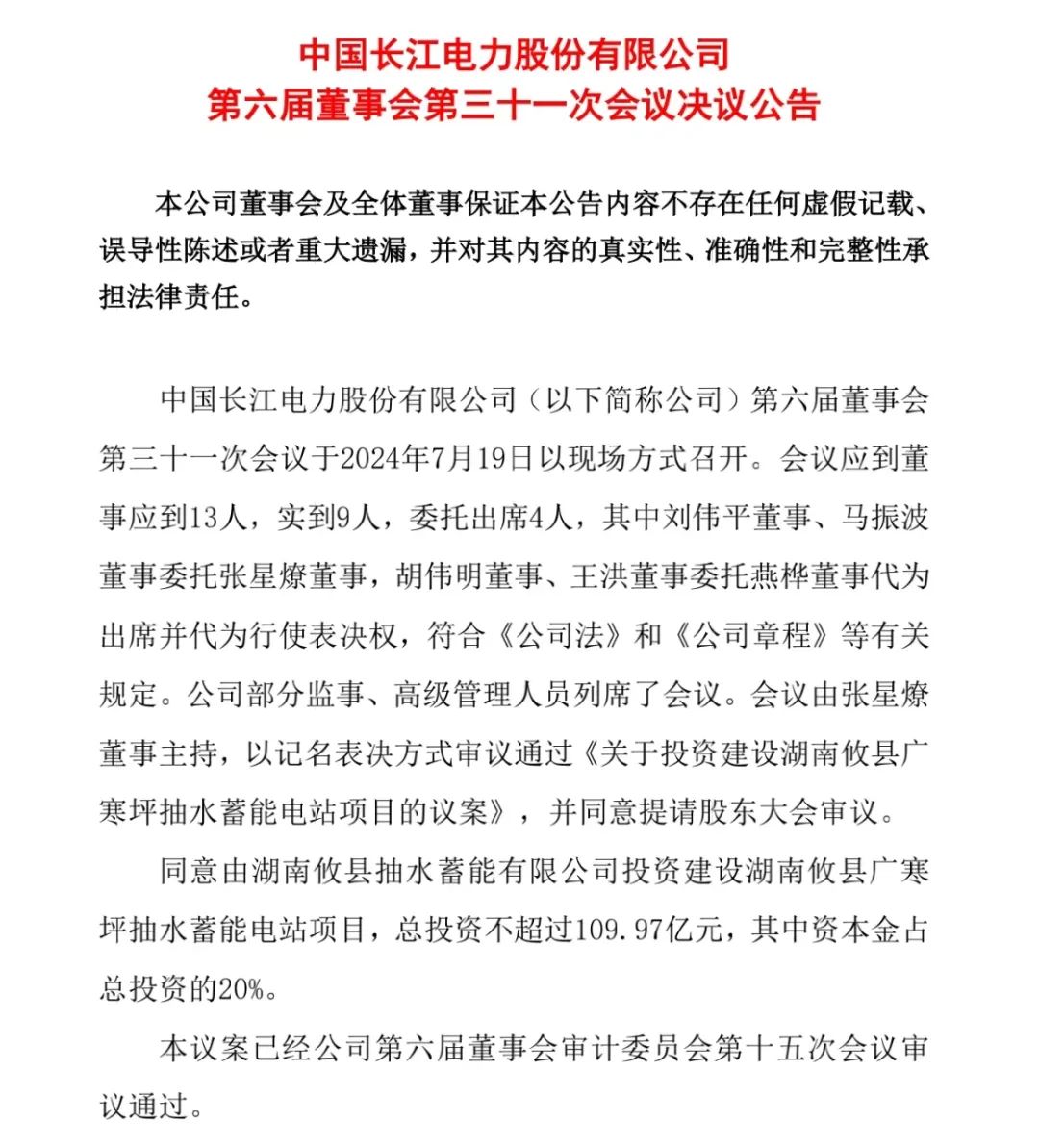 长江电力7月19日晚宣布,公司董事会审议通过《关于投资建设湖南省危县广寒坪抽水蓄能电站项目的议案》,同意湖南省危县抽水蓄能有限公司投资建设湖南省危县广寒坪抽水蓄能电站项目,总投资不超过109.97亿元,其中资本占总投资的20%。