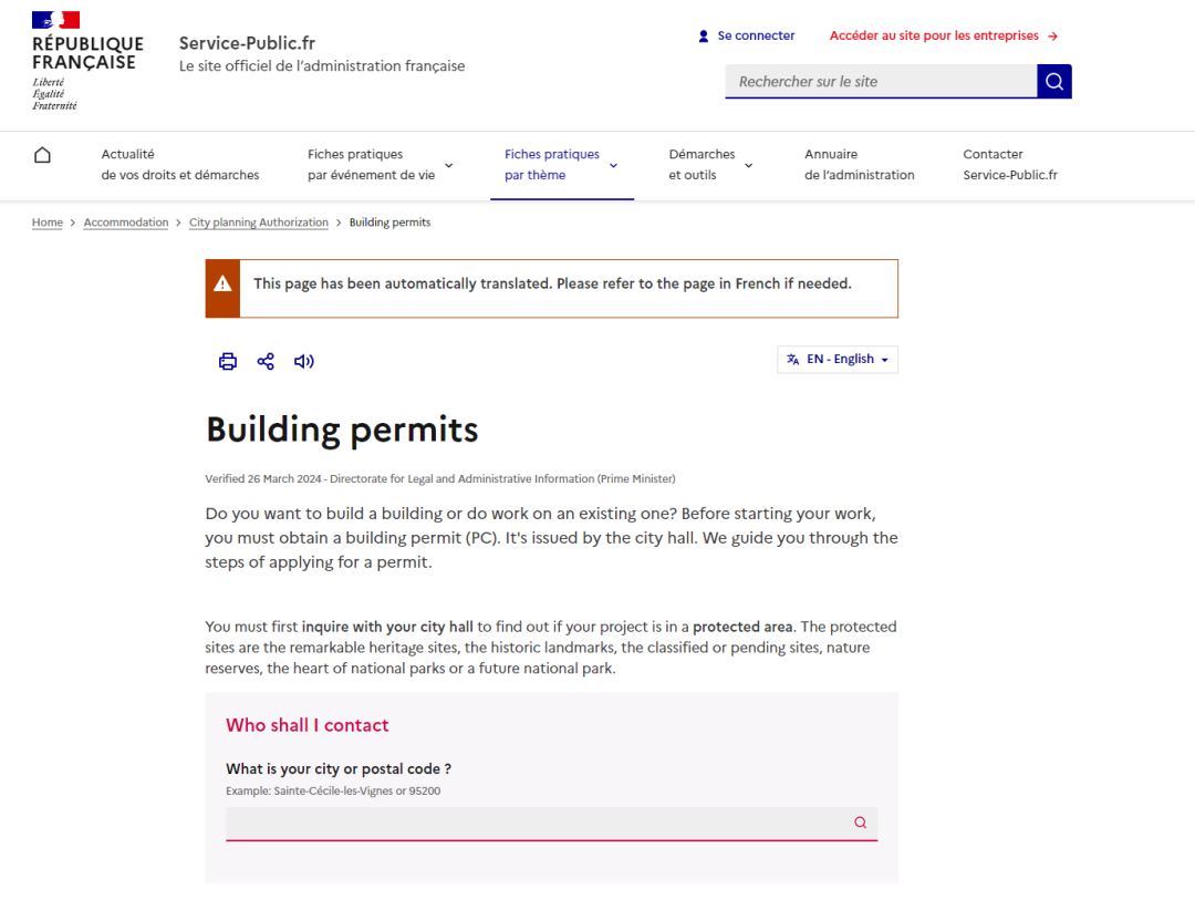 根据法国政府网站提供的信息,在法国,新建建筑或当前建筑必须取得建筑许可证。 (PC)。该许可证由市政厅颁发。获得建筑许可证通常包括十二个步骤,包括检查项目是否在建筑许可范围内,检查谁可以申请建筑许可证,填写建筑许可证申请表,将文件交给市政厅,了解调查时限,接受决定,查看土地上的建筑许可证,在拒绝或停止程序的情况下提出上诉,了解许可证的有效期,并申请延期,宣布施工现场,宣布项目竣工,缴纳开发税等。