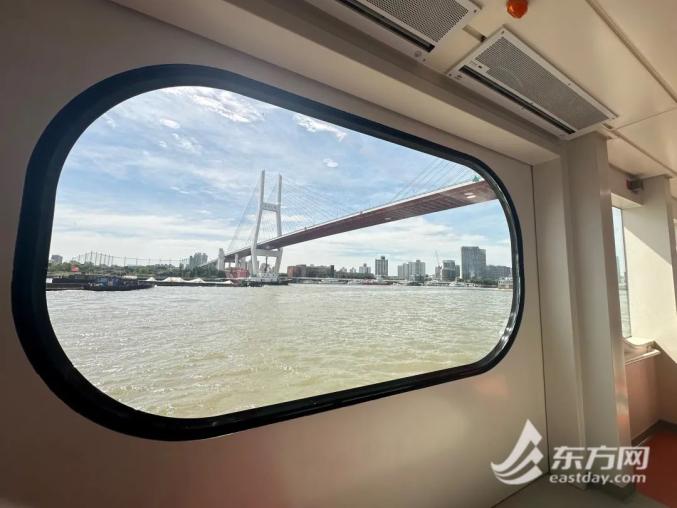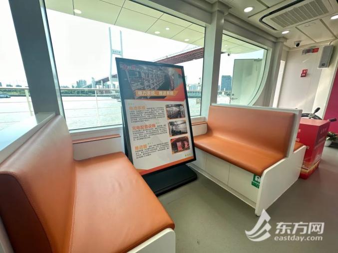 爬上楼梯,来到船舱的二楼。阳光通过顶层玻璃天窗洒进船舱,照射在柔软舒适的橙色座椅上。周围的玻璃幕墙充分发挥了自然光的直射。“坐在这里看江景太舒服了,就像坐游轮一样。”陈阿姨笑着说。