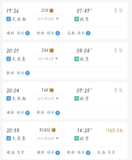(从大庆到北京的普速列车票较少)