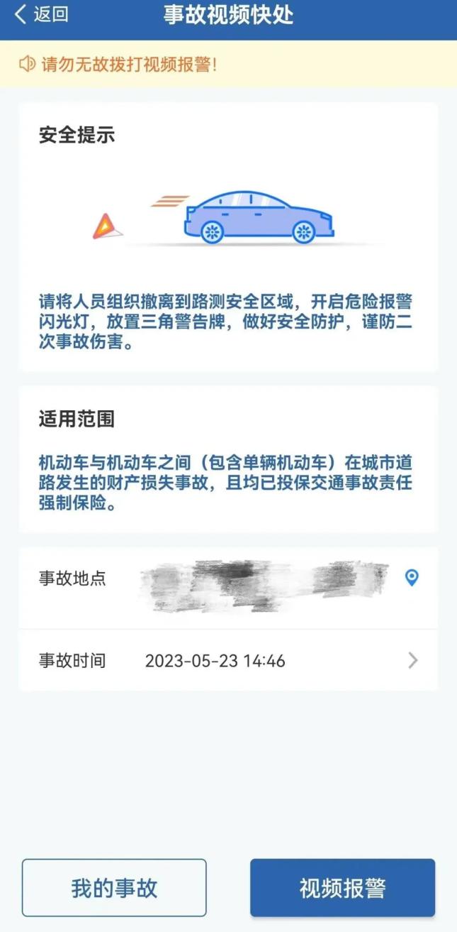 事故发生后,当事人当场启动“交管12123”APP,单击“事故视频快处”功能模块,按要求进行视频报警处理,系统自动定位事故地点信息。