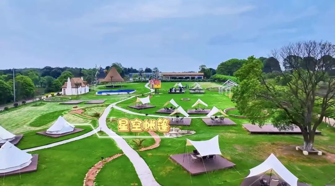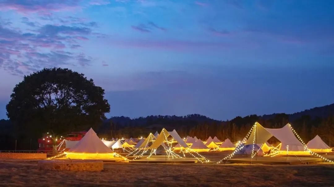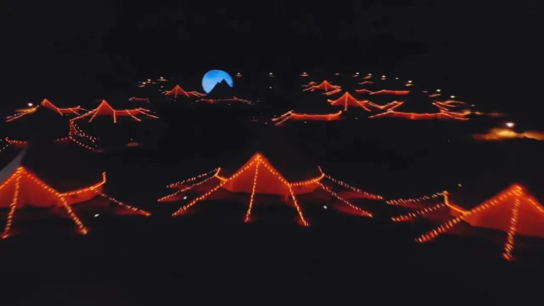 千帐灯野豪营地面积约30亩。基地以陪伴服务、家庭设计、多元化空间烤串用餐区、休闲活动三大理念为核心。基于“家”,基地分为户外帐篷区、天慕休息区、娱乐互动区、比赛表演区、篝火晚会区,淋浴房卫生间高标准配置。营地的灯光美学和场景美依托自然,让安义更加舒适。