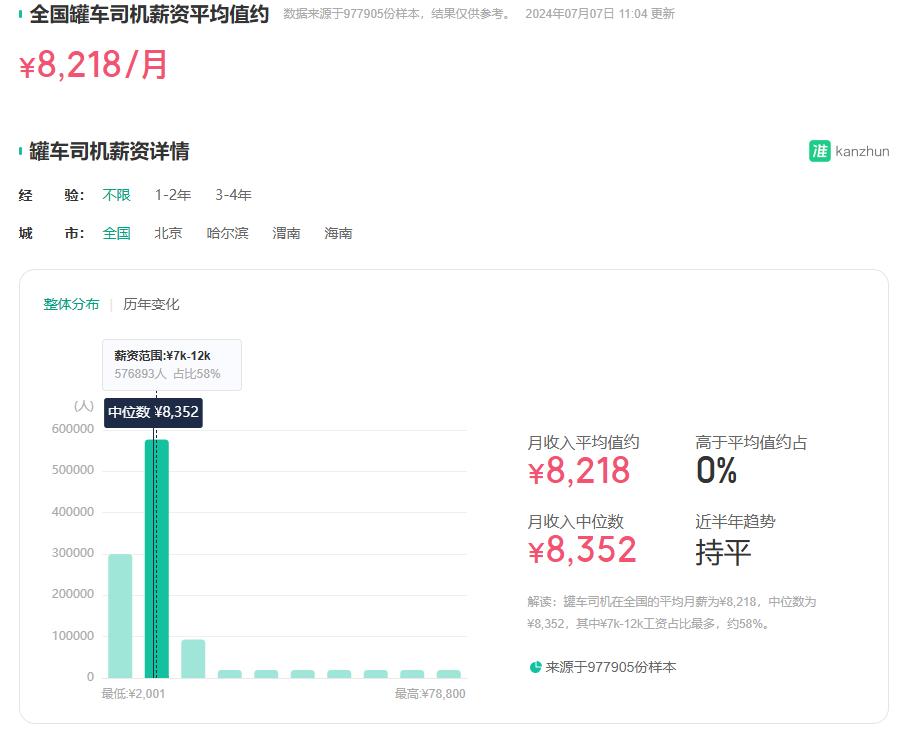 来自看准网(kanzhun)大约97万样本数据显示:全国罐车司机平均月收入8218元,低于坊间月收入1万元。