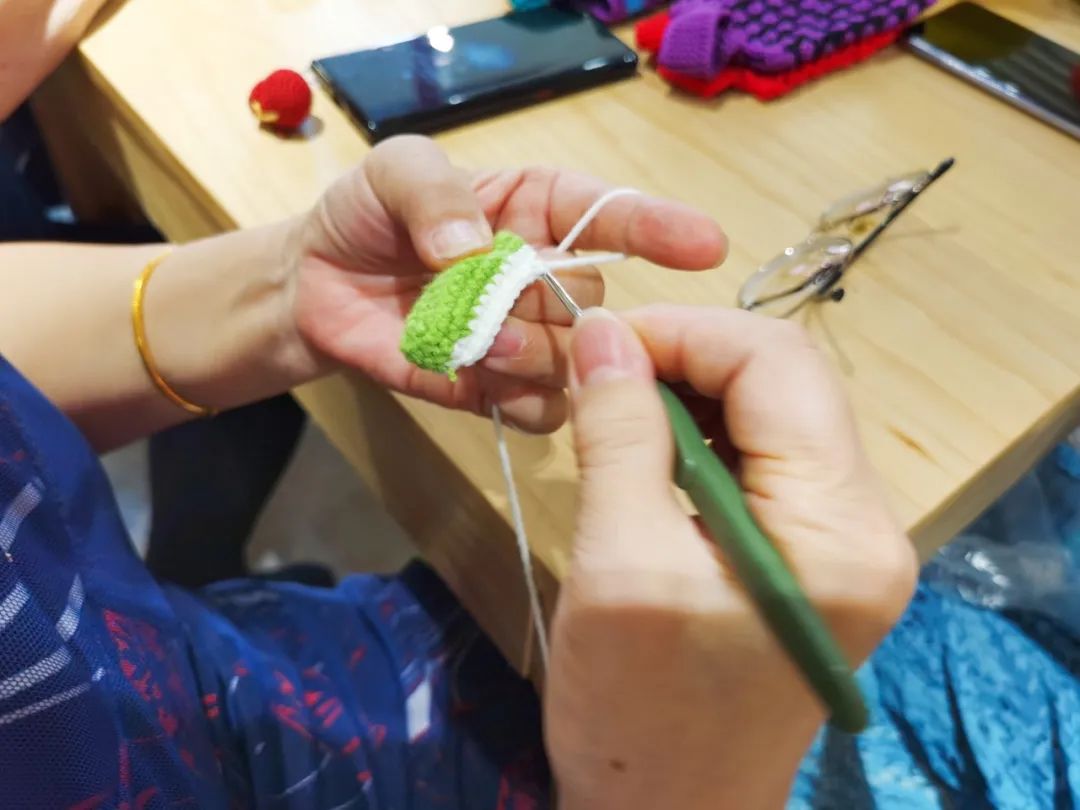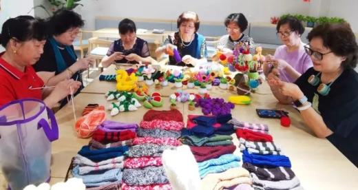 “我们每周四都会来这里‘报到’,讨论编织技巧,聊聊家常话。我们很开心。”正在编织手套的老人告诉记者,他们是分中心的爱心团队编织班,由十多名北新泾居民组成。根据季节和节日,成员们将制作垂直鸡蛋袋、模拟花束、毛绒小物件、手套、帽子等。