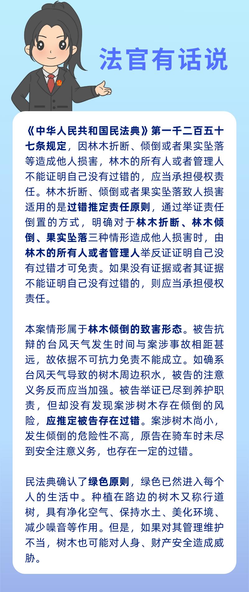 路边的树倾倒在骑自行车的人身上,谁的责任?