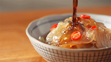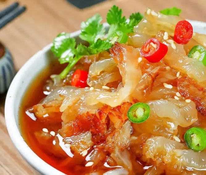配以黄瓜丝、胡萝卜丝等蔬菜。