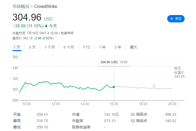 七月十九日,CrowdStrike美股市场一度暴跌15%,截至收盘,跌幅收窄11%,创2022年以来最大单日跌幅,收于304.96美元/股,最新市值为742亿美元,收于304.96美元/股,一夜之间挥发近百亿美元。